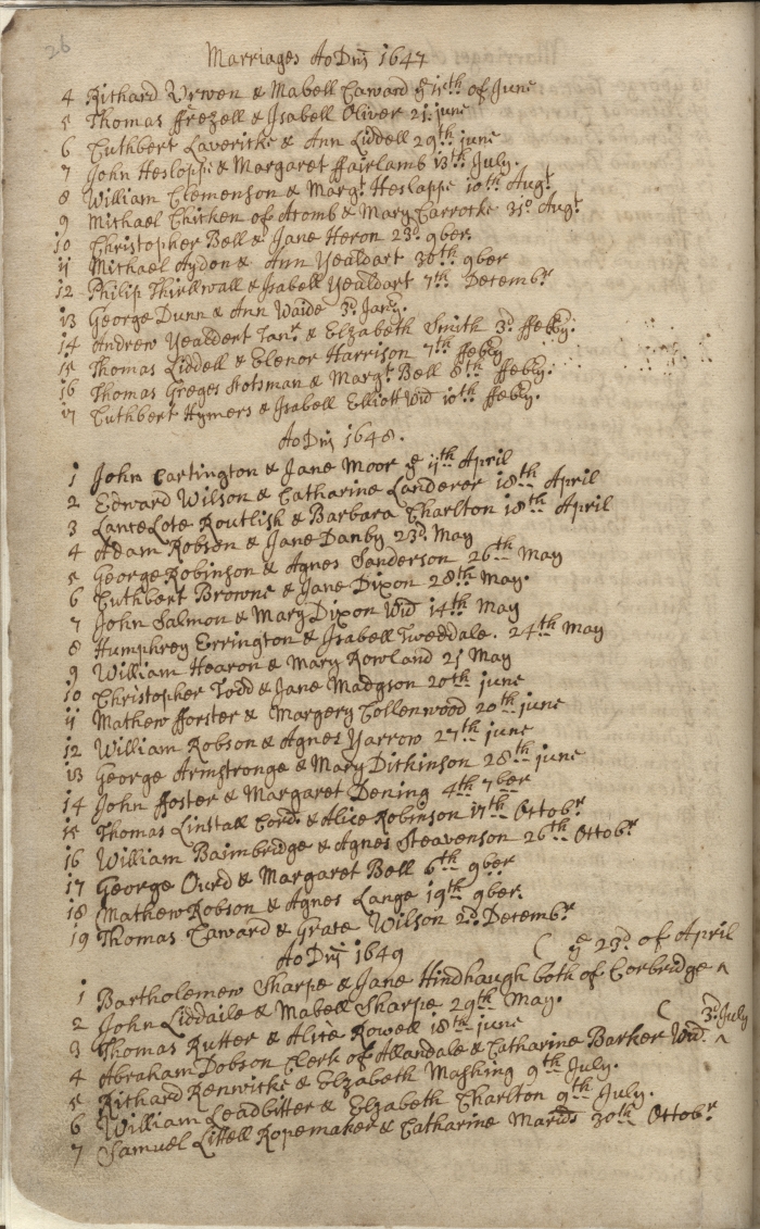 Note the caption Marriages Ao Dm (Anno Domini) 1647. The "year" covered the period 25 March 1647 (Lady Day) to 24 March 1648. This was the practice, until the Gregorian calendar was adopted in 1753, when the years then "ran" 1st January - 31 December, as currently.