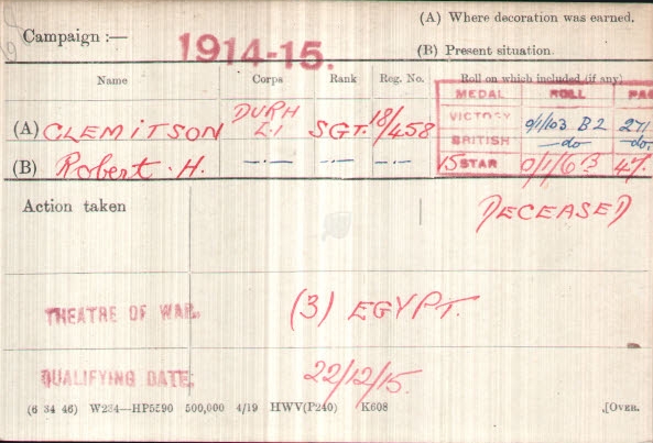 Robert Homer Clemitson, 1881-1919, from "branch 1" of the family, was a Pattern Maker by trade. In 1909 he emigrated to New Zealand, returning to Britain for a visit in July 1914. However, the Great War was just about to break out, and he enlisted in the 18th Pals Regiment in the Durham Light Infantry, serving in Egypt & France.